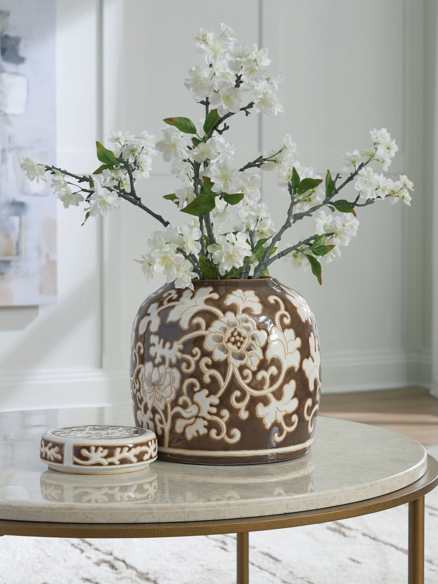 Evoke the feeling of a treasured heirloom with this exquisite jar. The warm palette and delicate floral pattern add a layer of curated worldly style to your favorite spot. Let it stand alone as a sophisticated art piece on your mantel, or fill it with a few fresh stems to bring a touch of life to your room.