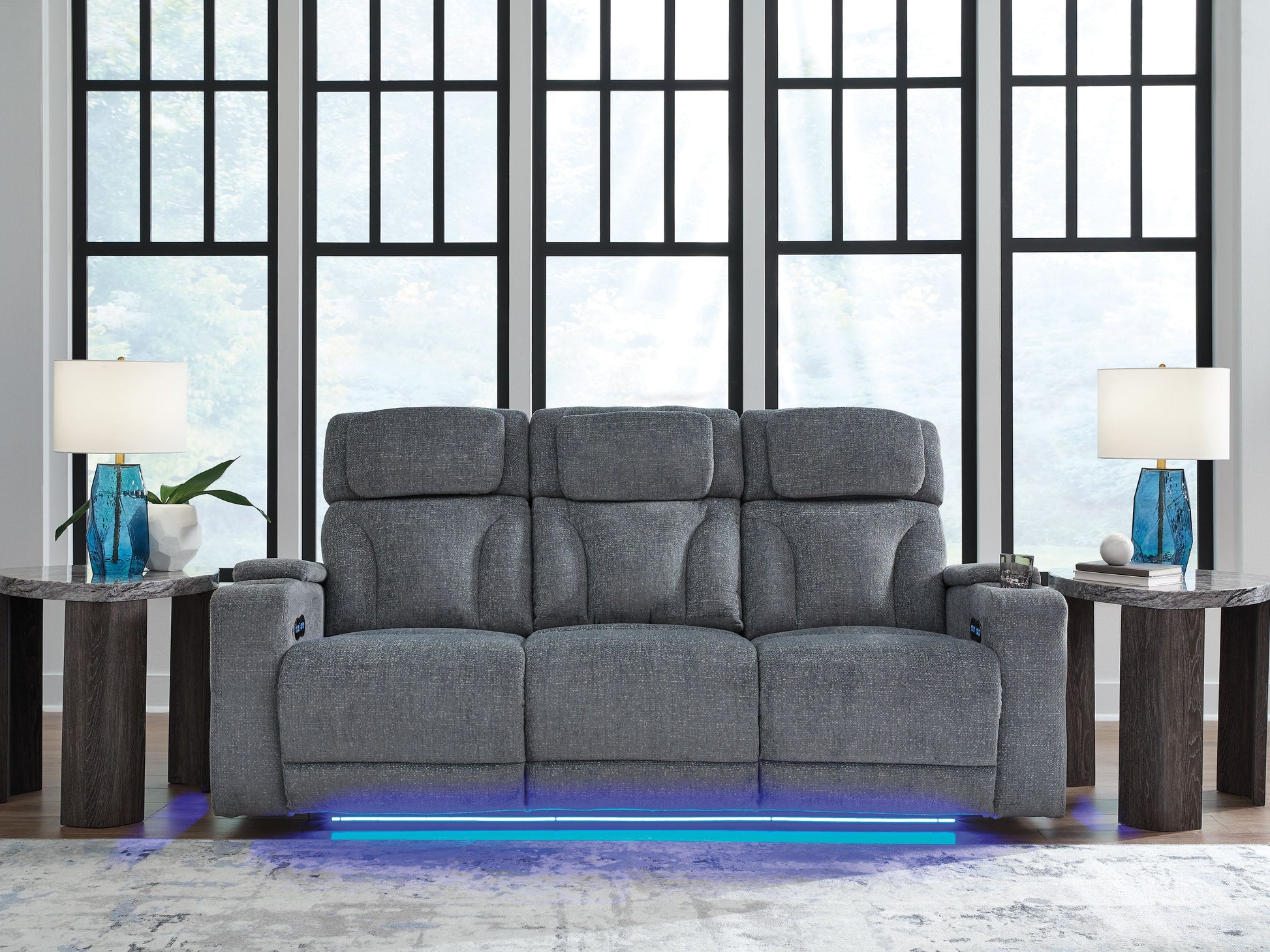 Chill-out time has never looked better. This power reclining sofa's adjustable headrest ensures a perfect view of the TV no matter how far back you recline, while the extended ottoman takes your comfort to the next level. A drop-down table is decked out with reading lights and charging features. Plush yet practical Next-Gen Nuvella™ performance fabric and ambient lighting complete the theater-style experience. It's time to relax, nap or binge-watch in the best seats in the house.
